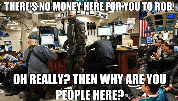 This scene is from The Dark Knight Rises when Bane robs Gotham’s version of Wall Street. The day trader assumes he wants physical cash so he says “There’s no money for you to rob”. To which Bane responds: “Oh really? Then why are you people here”.