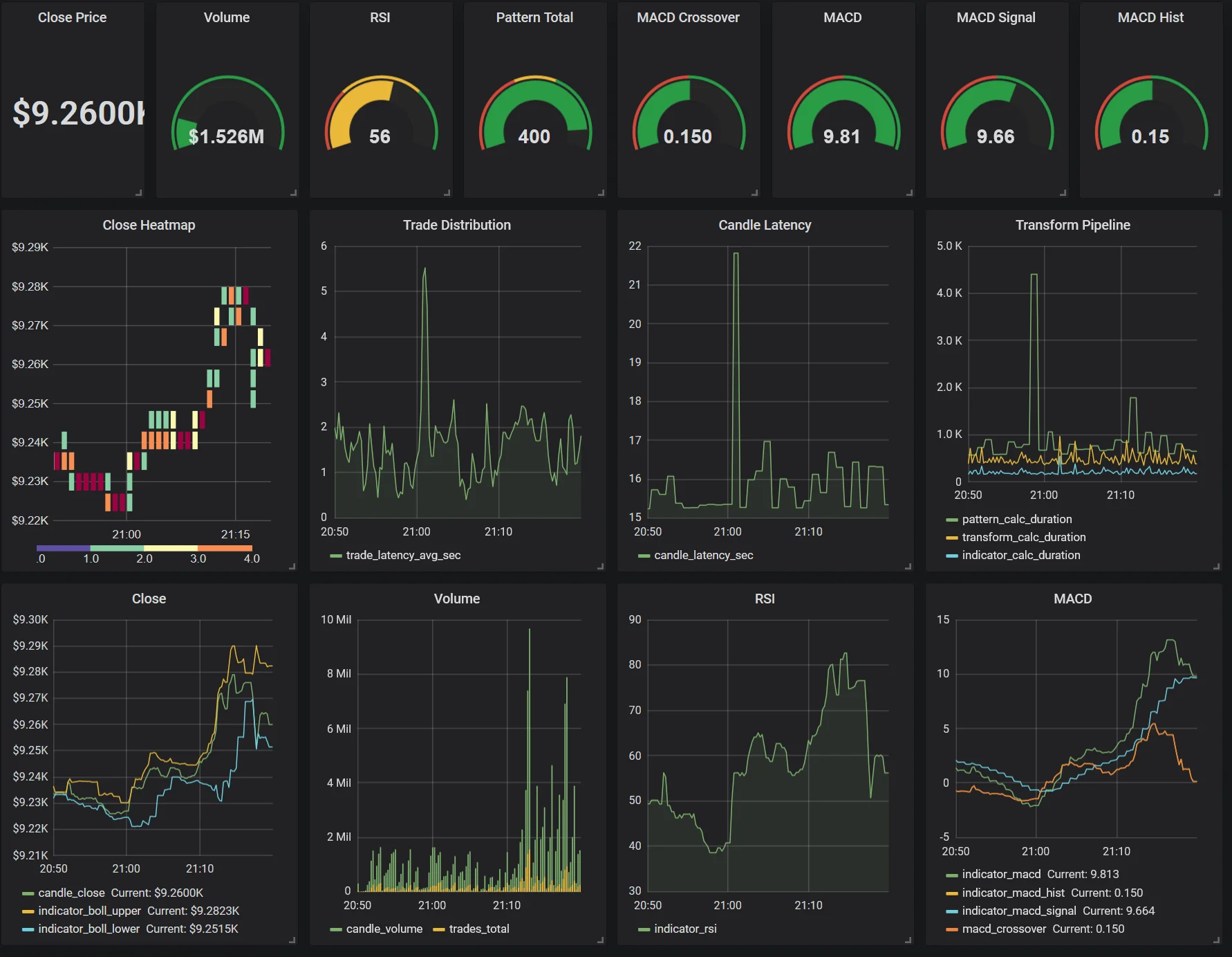 Grafana Dashboard which displays indicators as well as latencies from the exchange to processing on my servers. Trade and Candle latencies are in seconds, pipeline durations are in nanoseconds.