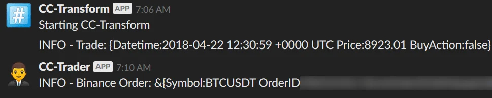 Slack notifications from two of my nine microservices that make up my trading pipeline.